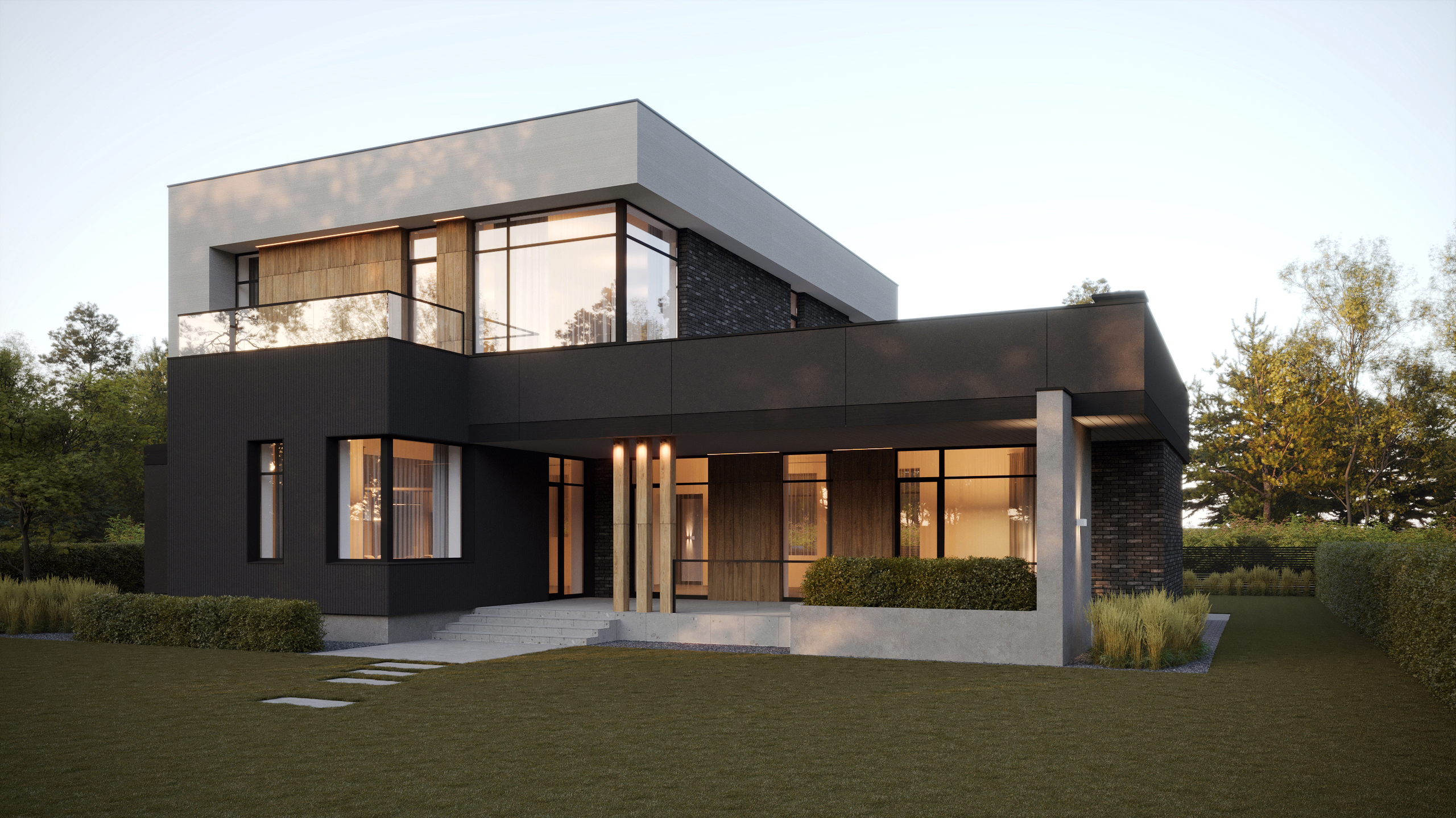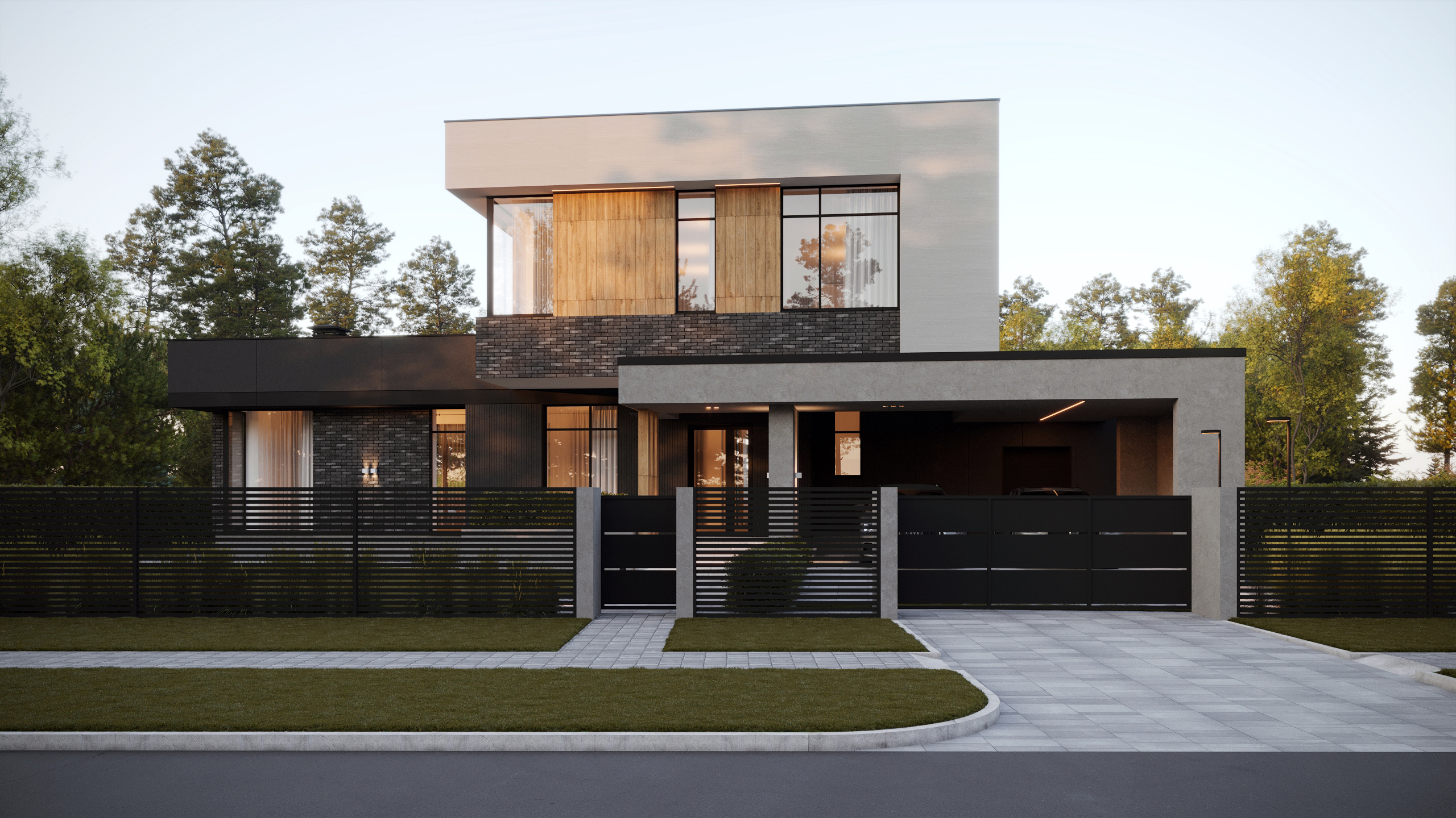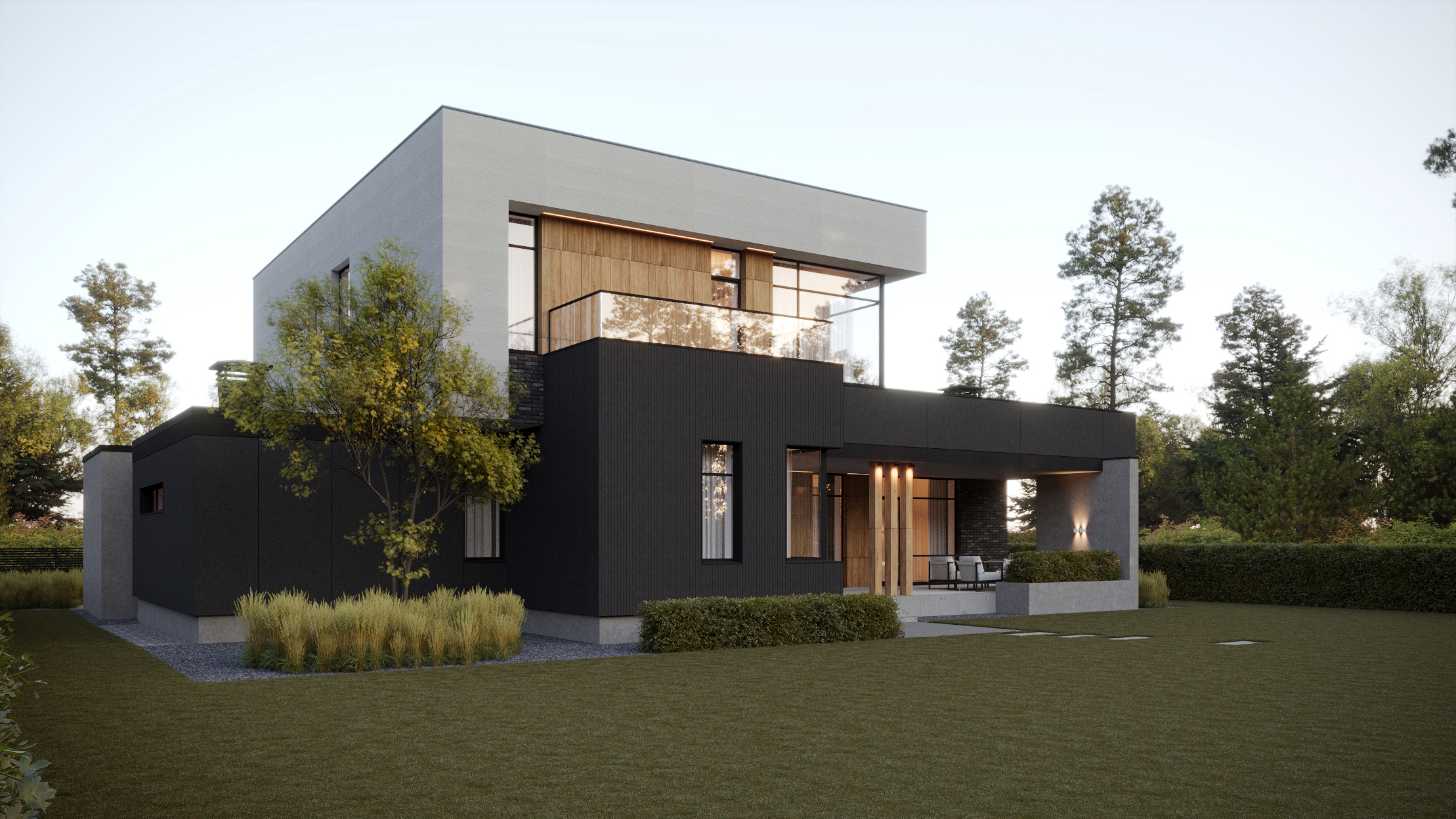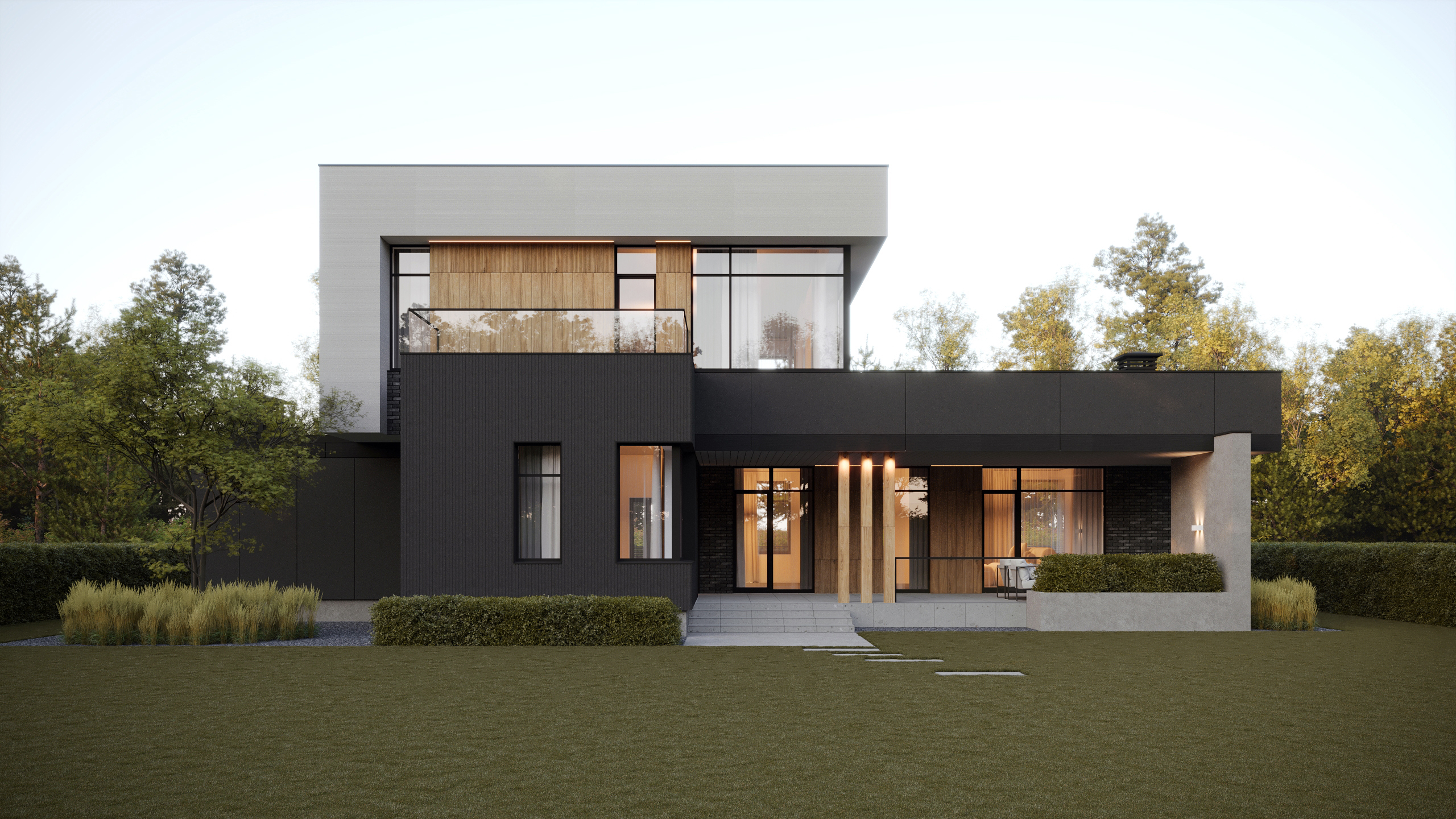Лаконичный проект фасадов двухэтажного дома в деревне Лесковка.